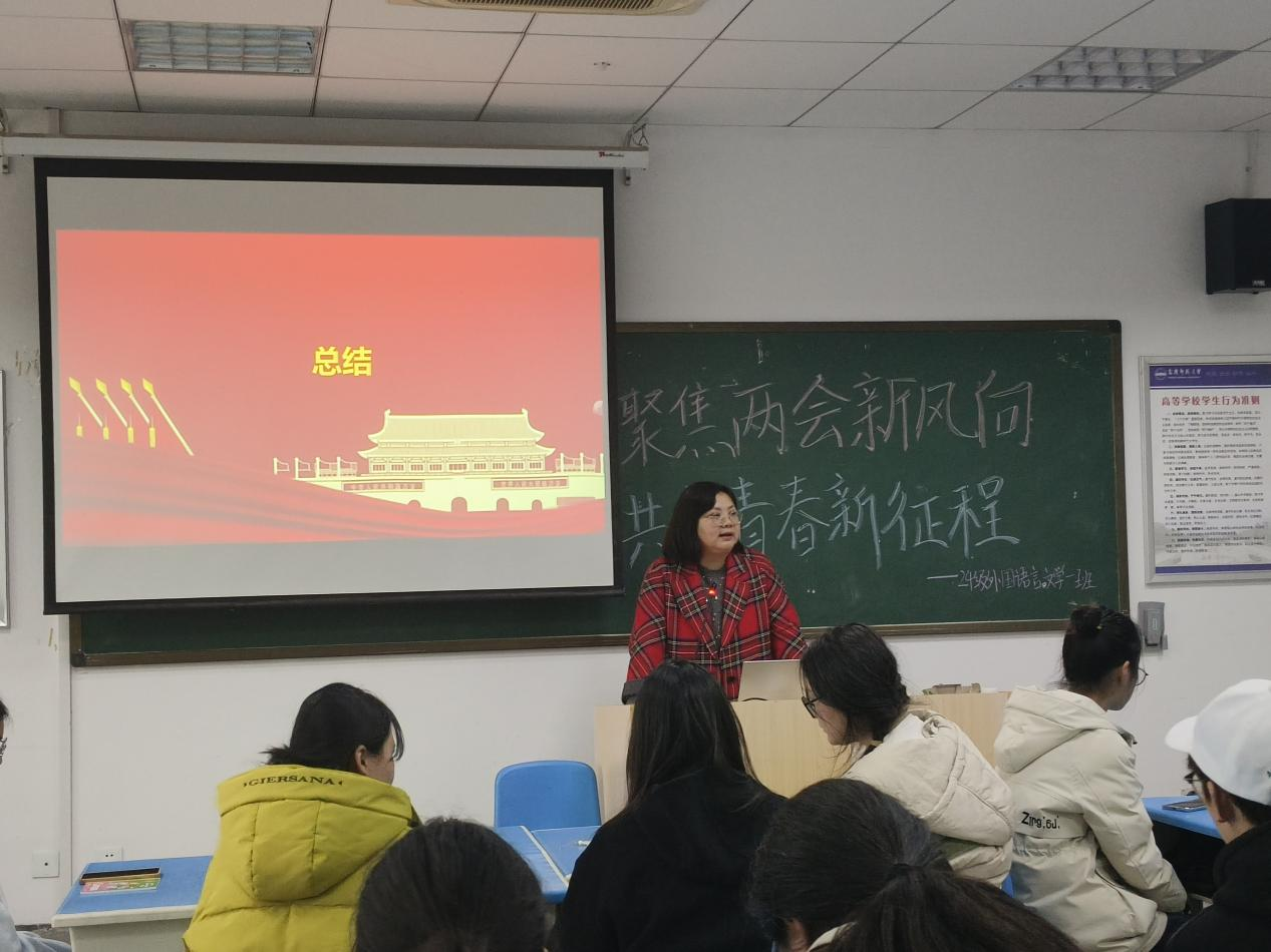 借助学院精心统一制作的PPT和双语学习视频,各班级在主题班会活动中生动形象地介绍了两会的基本概念、重要议程以及会议的重大意义,从政府工作报告中的民生举措,到教育、科技领域的发展规划都细致解读,让学生们对两会精神有了更直观、更深刻地理解。