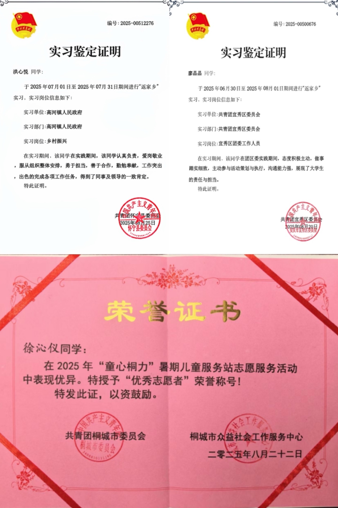 由董馨悦、何婷婷、江宏、张玉琳、谢彬玲、卢天星、童宜丹、齐帅、柏跃宇这九位同学组成的赴安徽省六安市金安区银龄关爱暑期社会实践团在当地开展了一系列实践活动,包括与村委卫生室工作人员一同发放医疗卫生宣传资料,组织老年人免费测量血压、血糖:宣传发放防诈骗资料,教老年人使用智能手机:结合英语专业知识,组织特色活动等。当地部门在表扬信中指出,“他们以实际行动践行了‘请党放心,强国有我’的青年誓言,展现了当代青年以‘青春之我,融入青年之奋斗’的风采。”