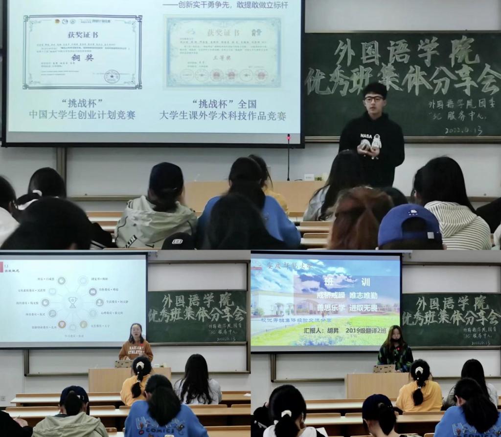 为进一步发挥优秀班集体的引领示范作用,提升班级凝聚力,引导班级明确创建目标和发展方向,4月13日下午,beat365平台唯一官网于E107举办优秀班集体分享会,特邀请2021年度校十佳班集体2018级英语1班、先进班集体2019级商务英语1班、2019级翻译2班的班委们分享经验,2021级全体班委到场聆听。
