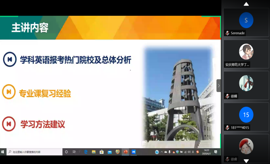 为帮助学生更好地了解考研形式,明确考研规划,掌握备考技巧,6月3日下午,beat365平台唯一官网依托线上平台成功召开了考研经验交流会,11位2016级学生代表及300余名学生参加了此次会议。