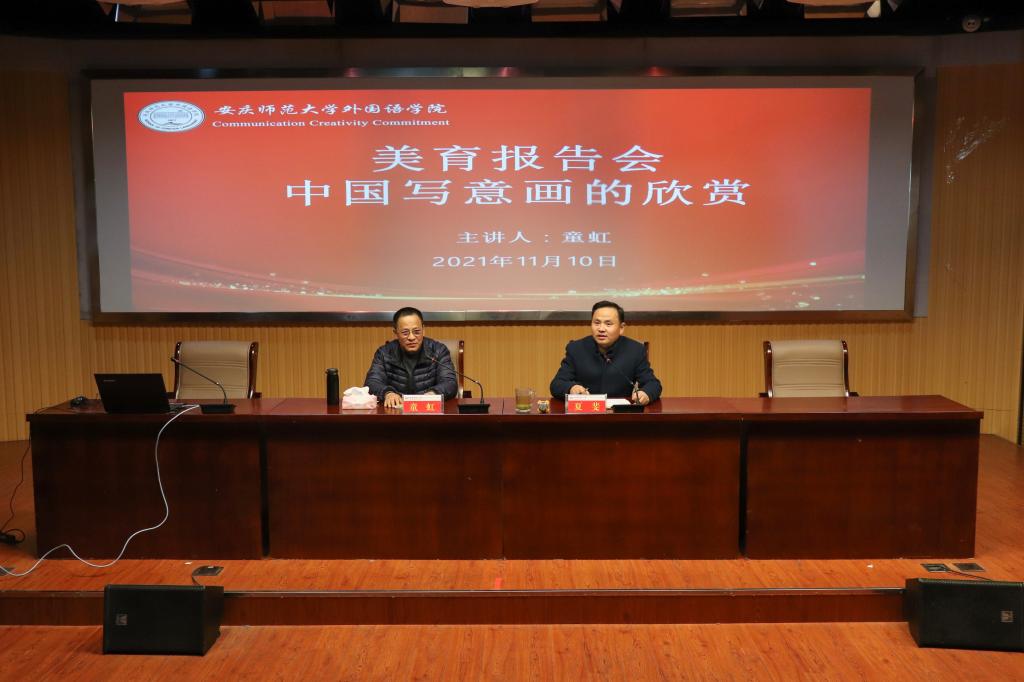 11月10日,beat365平台唯一官网在E503教室举行以“中国写意画的欣赏”为主题的美育报告会,安徽省美术家协会会员、安庆市美术家协会副主席、安庆市政协书画院画家童虹应邀作报告,报告会由学院党委副书记夏斐主持,学院入党积极分子、青马班学员与艺术俱乐部成员共130余名学生参加了报告会。