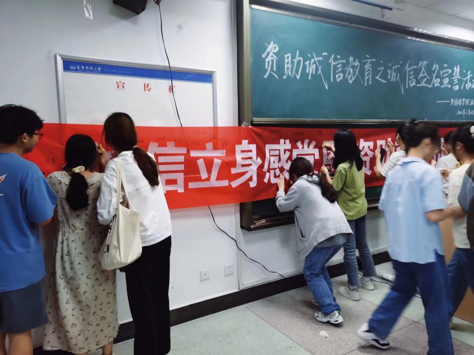 活动伊始,主持人宣讲了本次活动的流程和意义。受资助学生仔细阅读资助诚信承诺书,并在承诺书签名。接下来主持人带领同学们进行宣誓,他们挺直身体,举拳宣誓,“我承诺向学校和银行所提供的材料真实有效,绝无虚假……”宣誓声响彻教室。最后,同学们自发走上讲台在活动横幅上签下自己的名字,表达对国家资助政策的感恩。2020级外国语言文学类专业李红珍同学感慨道:“在这次活动中,横幅上签字的环节令我印象最为深刻,我觉得这项活动充满意义和仪式感,激励我成为一个诚实守信、知恩感恩的人。”