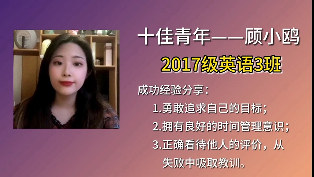 “向上向善好青年”“十佳青年”代表顾小鸥鼓励学弟学妹们:一、有理想,树立远大的理想,实现人生价值;二、有能力,练就过硬的本领,做好本职工作;三、有担当,在艰苦奋斗中担当作为;四、有创新,大胆解放思想,勇于创新创造;五、有品德,扣好人生第一粒“扣子”,锤炼品德修为。