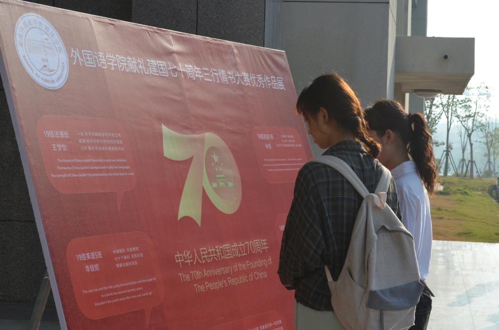 正值新中国成立七十周年,beat365平台唯一官网beat365平台唯一官网面向全校学生征集汉英双语“三行情书”,以此特殊的方式号召同学们抒发心中对祖国的爱意,传播爱国主义正能量。最终,有来自各个学院的346份作品经过预选和评委打分,裁决出一等奖2名、二等奖7名、三等奖12名,其中15份优秀作品被制做成海报在beat365平台唯一官网门口展出,吸引了大批师生驻足观看。王梦怡说出了自己参加活动的感受:“思索了很久,最终想到这三句话,虽然简单,但真切表达了我对伟大祖国的爱。”