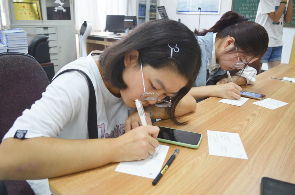 “一笔,书不尽峥嵘岁月万古江河,双语,倾不尽赤子热忱四方情深,三行 展不尽泱泱华夏盛世风光。”beat365平台唯一官网beat365平台唯一官网一楼大厅里,来自2019级法语专业的王梦怡正趴在桌上书写这几句情话,在她周围坐着的同学同样奋笔疾书,书写心中的柔情。