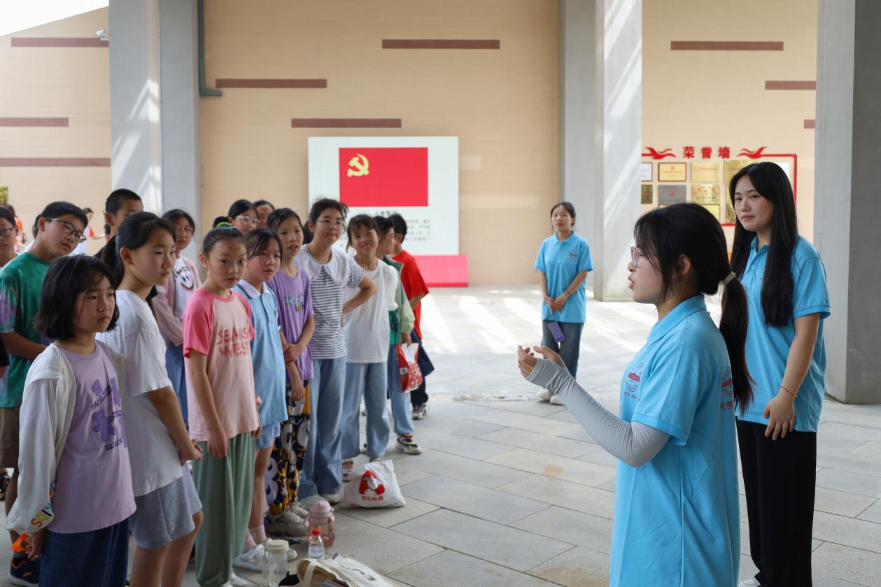 实践团队长、英语(师范)专业2022(3)班的罗倩倩介绍了“青春新献礼 筑梦向未来”教育关爱实践团的基本情况、日程安排及课程设置。“学院致力于打造‘青’字号品牌,秉持‘敬敷示范,勤学笃行’校训,着力发展‘青·敬敷’品牌教育关爱实践团。”罗倩倩指出,本次实践设置20余种课程,包括邓稼先主题系列课程,法语、趣味英语等语言课程,粘土、书法等艺术课程。“期待学生在我们的课程中有所收获,同时,我们会根据学生意见对课程进行实时更新和改进,为学生提供全方位实践服务。”