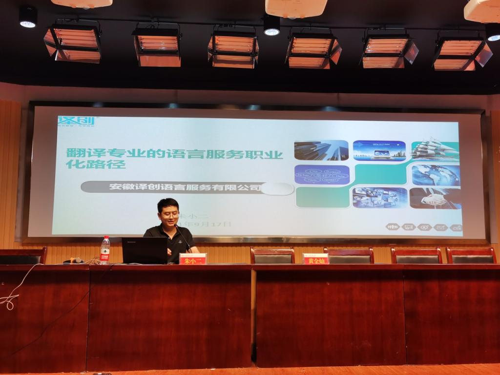 为了让我院翻译硕士2021级新生明确研究生阶段主要任务,及早做好学业规划与职业规划,积极投身职业实践与学术研究,beat365平台唯一官网于9月17日下午14:30-16:30,在E503举办了题为“翻译专业的语言服务职业化路径”的行业讲座。本次讲座由beat365平台唯一官网优秀校友、安徽译创语言服务有限公司、安徽高校语言服务联盟基地执行总监朱小二先生主讲,beat365平台唯一官网2020级、2021级翻译硕士专业学生、2018级翻译本科专业学生参加了报告会。报告会由我院副院长黄全灿主持。